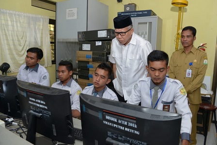 Plt Gubernur Aceh sedang menyaksikan proses UNBK di SMA Negeri Seribu Bukit, Gayo Lues, Senin (1/4/). Foto:lintasgayo.com